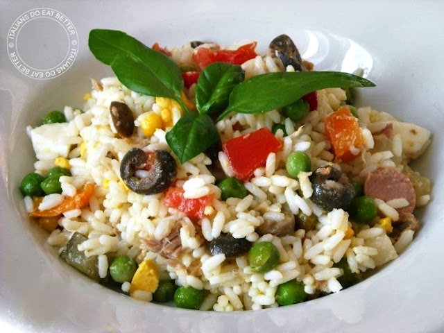 Durante i mesi estivi preferisco pietanze fresche e veloci, come le insalate di pasta o di riso, che possono essere preparate il giorno prima e conservate in frigorifero fino all'ora del pasto. L'estate scorsa ho pubblicato due ricette di insalate di pasta che vi consiglio di assaggiare, l'insalata di pasta mediterranea e l'insalata di pasta alla marinara, mentre quest'oggi vi propongo la mia Insalata di Riso, una ricetta che preparo da anni, ma chissà perché finora non ho mai pubblicato, per cui eccola qui.