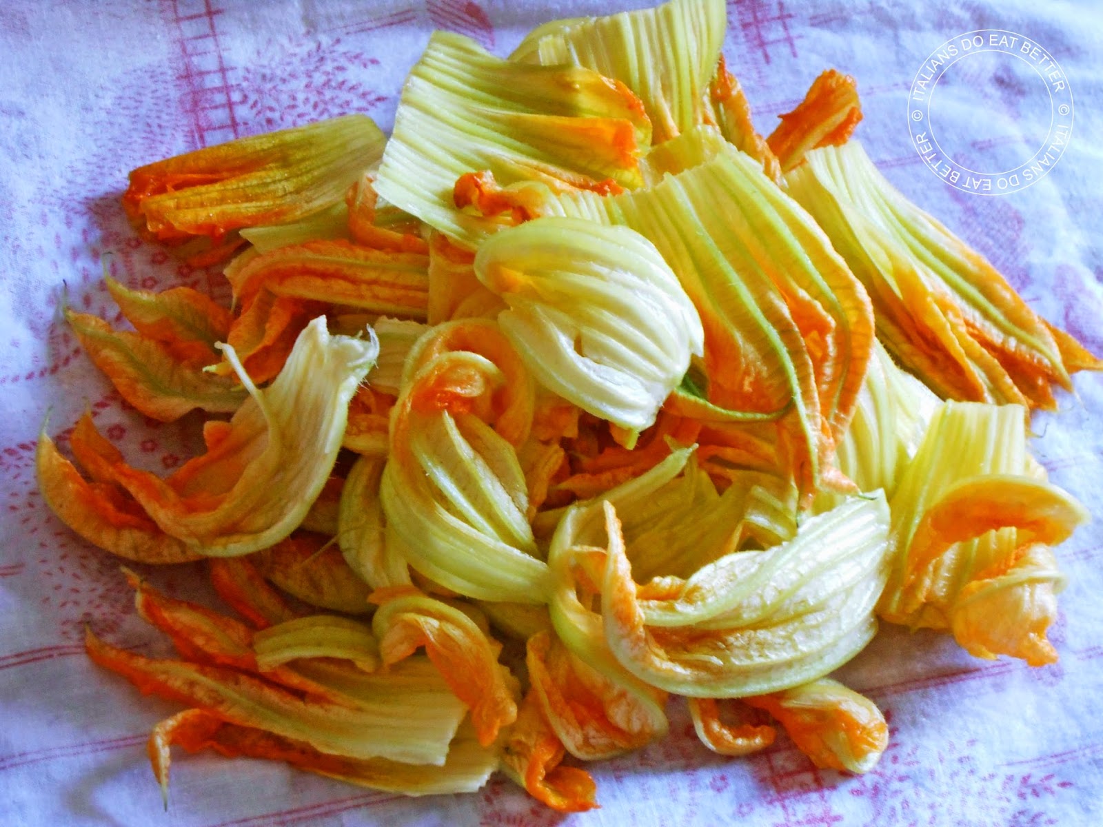 - Pulite i fiori di zucchine ed eliminate la base verde e dura e il pistillo, quindi sciacquateli, asciugateli, salateli leggermente e fateli riposare una mezz'ora (è il metodo usato dalla mia mamma).